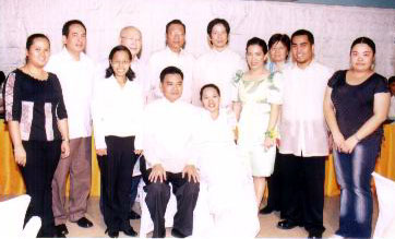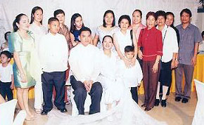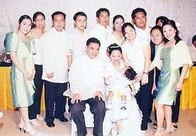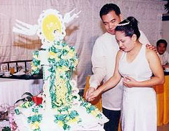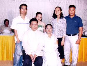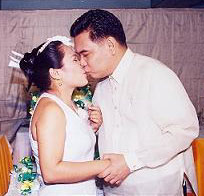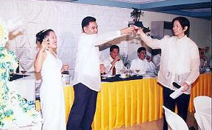 ![]() ![]() ![]() (from left) Danny and Joy kiss at the reception; slice the wedding cake; and best man Roland Tolentino leads the toast at the University Hotel in UP Diliman, Quezon City on December 28, 2004.